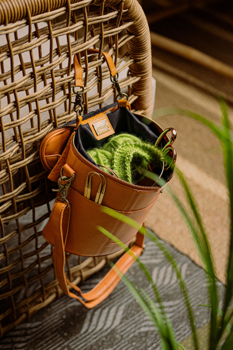 Lala Crossbody strikkes ovenfra og ned i snoningsmønster og har en ombukket kant. Der strikkes huller til skulderstrop og I-cordsnoren. Bunden monteres ved at samle masker op i hvert hul af Duff bunden, som syes sammen med taskens masker med maskesting. Slutteligt strikkes I-cordsnoren.